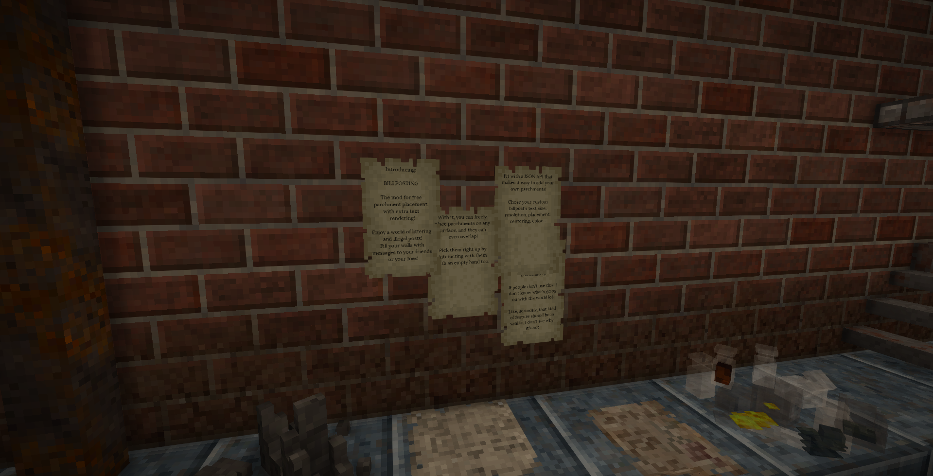 - Creative mode support: don't use up a parchment to place a billpost when the player is in creative mode