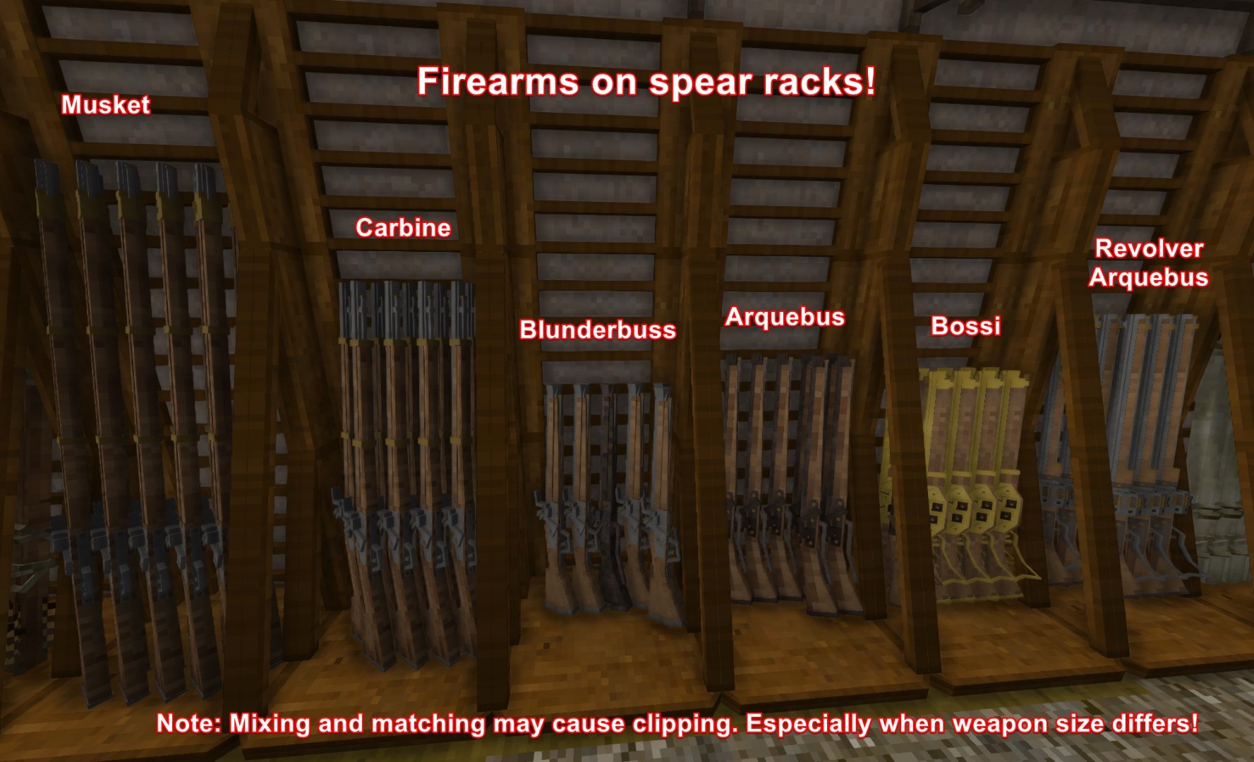 - Firearms on spear racks that are different types may have larger clipping issues when mixing and matching. Preventing this with just a patch mod is very difficult so I probably won't be able to fix this.