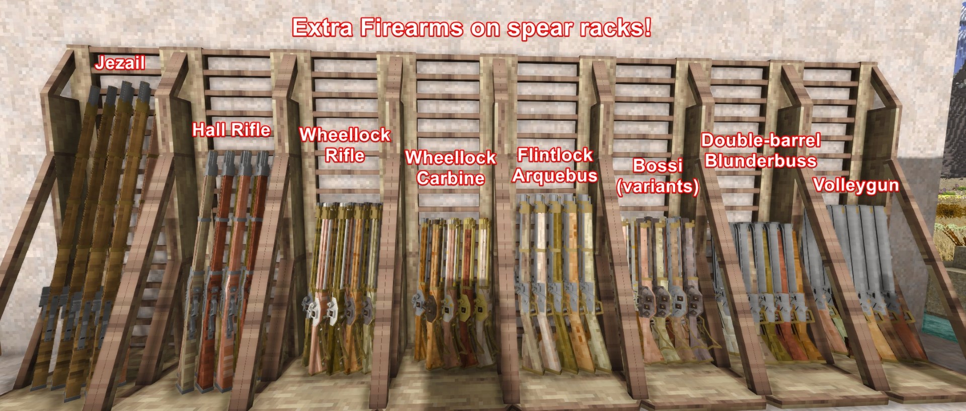 Spear rack: Musket, Carbine, Arquebus, Blunderbuss, Bossi carbine, Revolver Arquebus